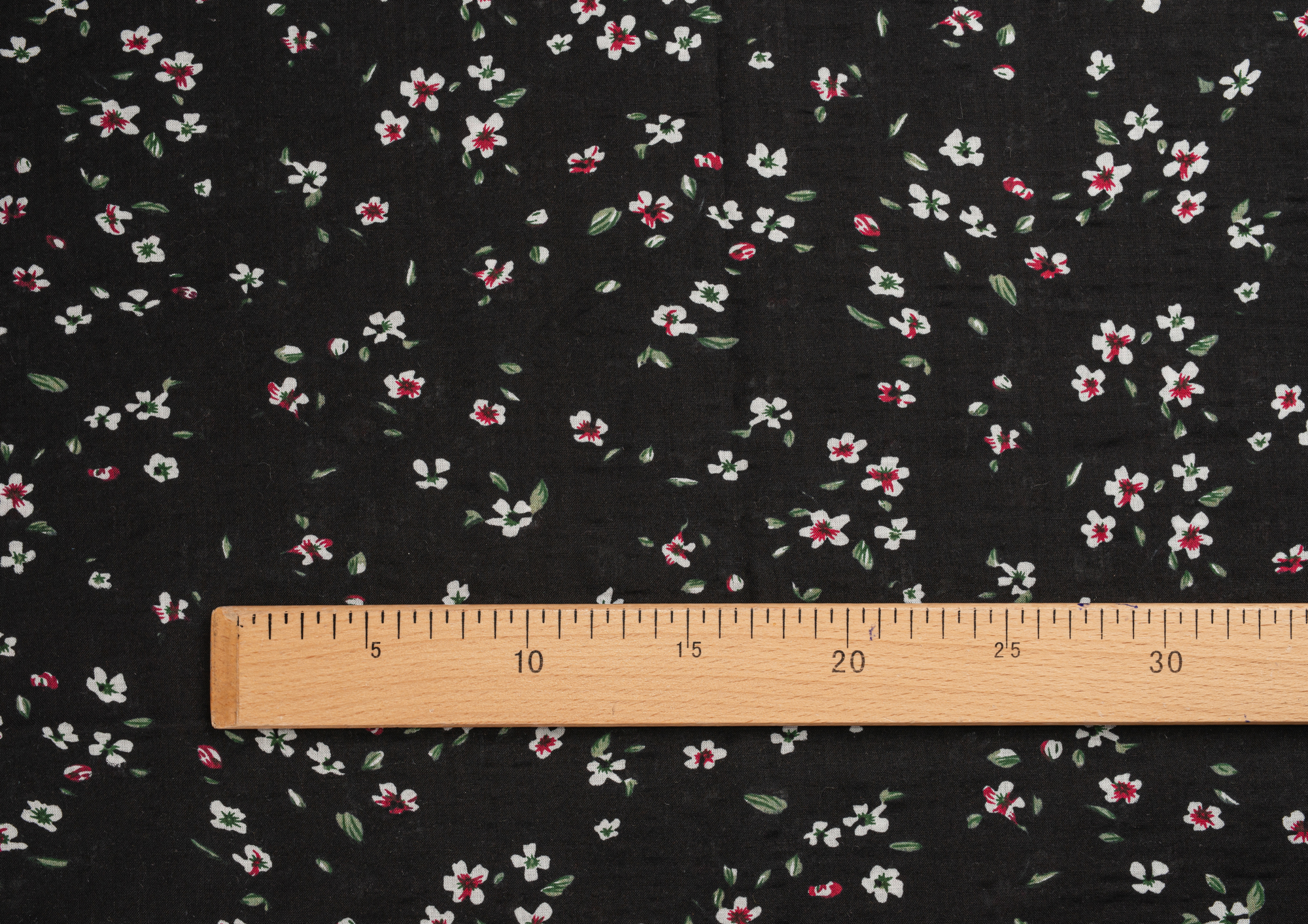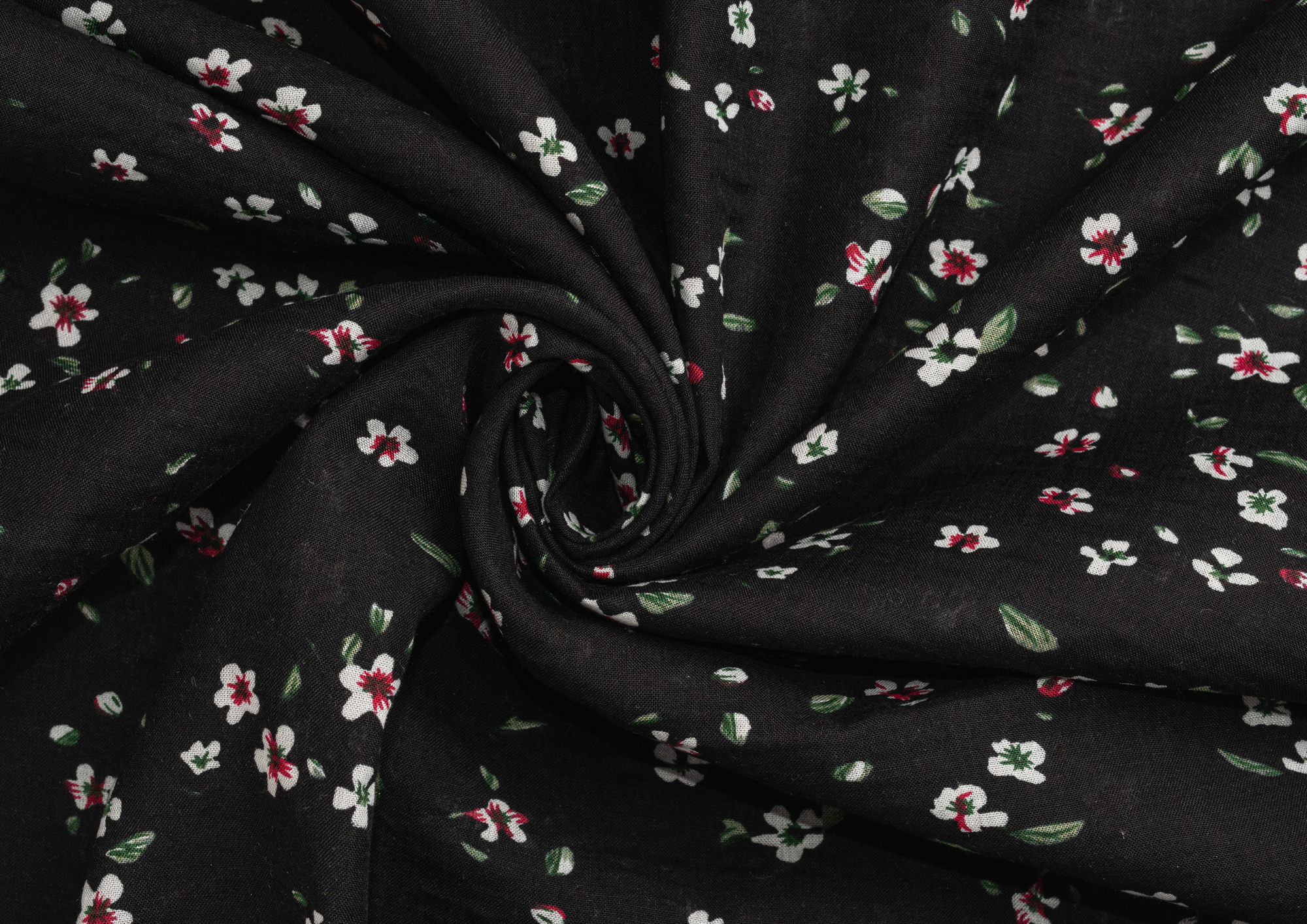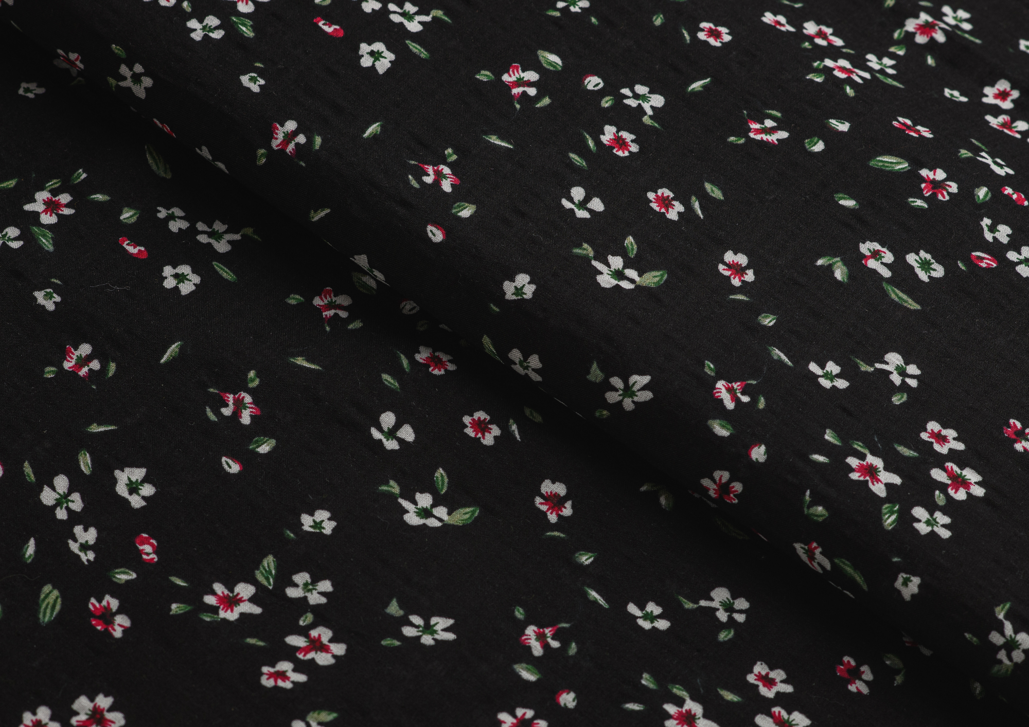 Ткань Штапель жатка принт Белые цветочки на черном