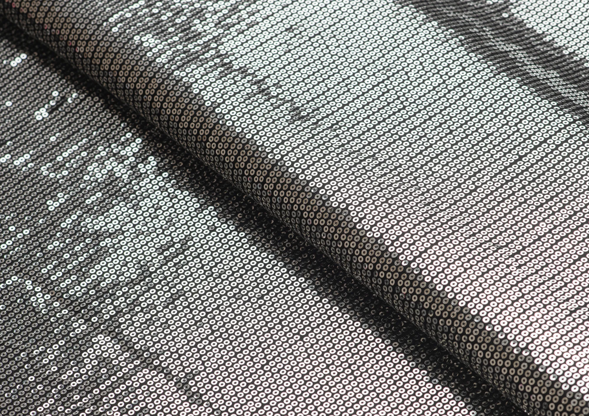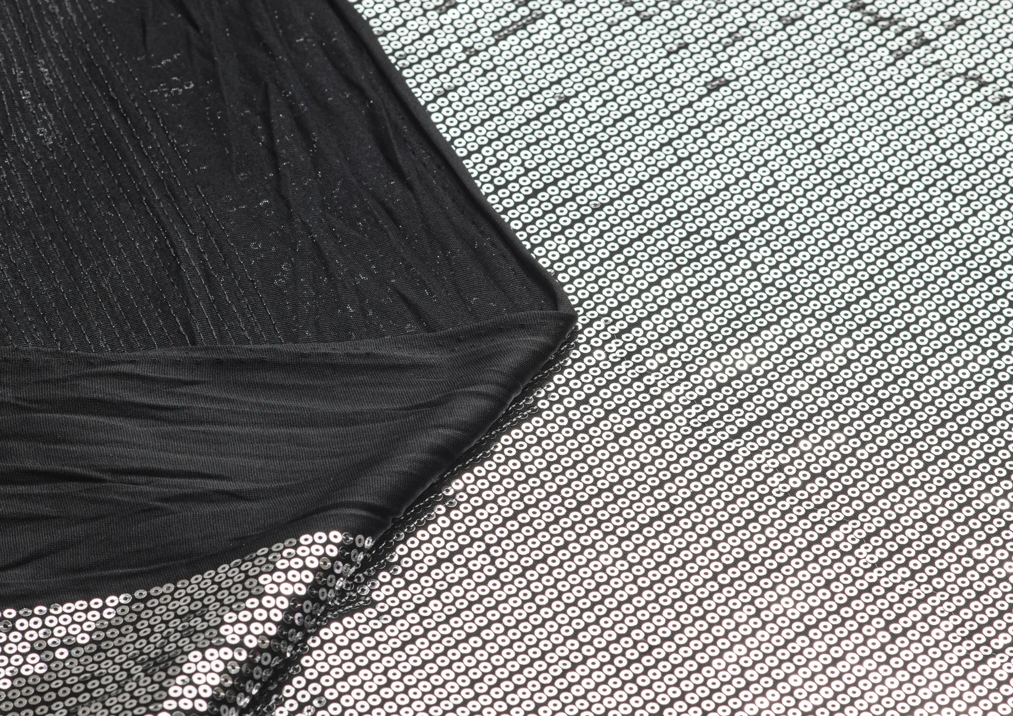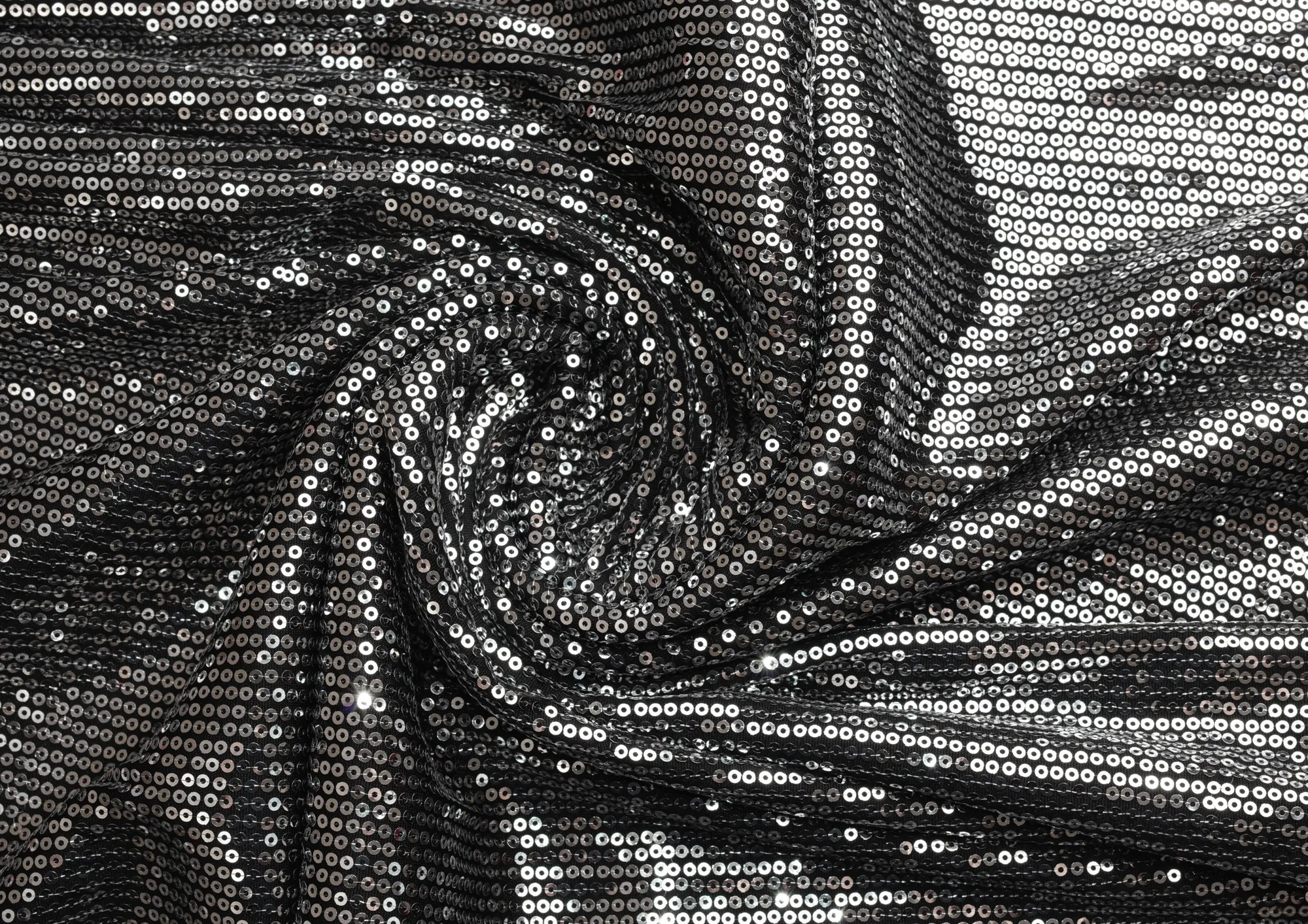 Тонкий трикотаж, поверхность которого расшита пайетками диаметром 0,3 см .Рабочая ширина 140 см. Ткань эластичная , хорошо подходит для пошива сценических костюмов , для декорирования одежды.