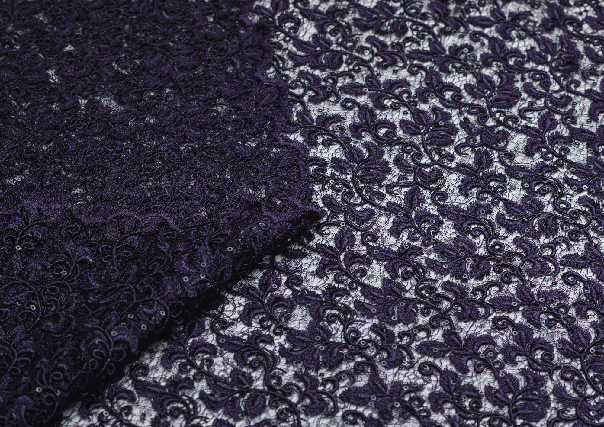 Кружево с пайетками в тон полотна, фестоны с двух сторон, выполнена на тонкой сеточке. По всем полотну равномерно расположен цветочный орнамент 3d. При пошиве требует подклада. Из кружево шьют нарядные, вечерние, торжественные платья, костюмы.
