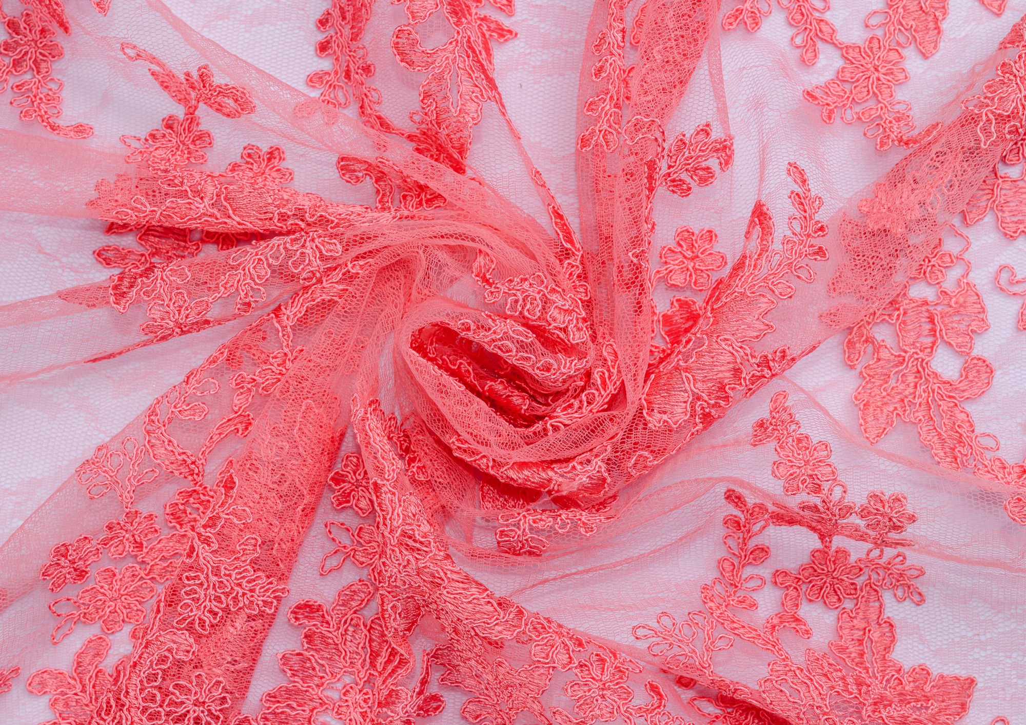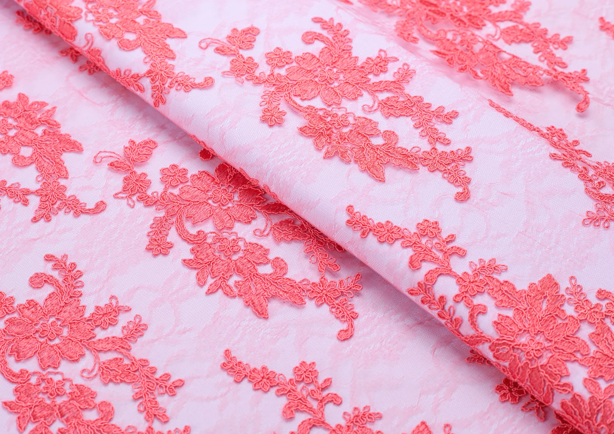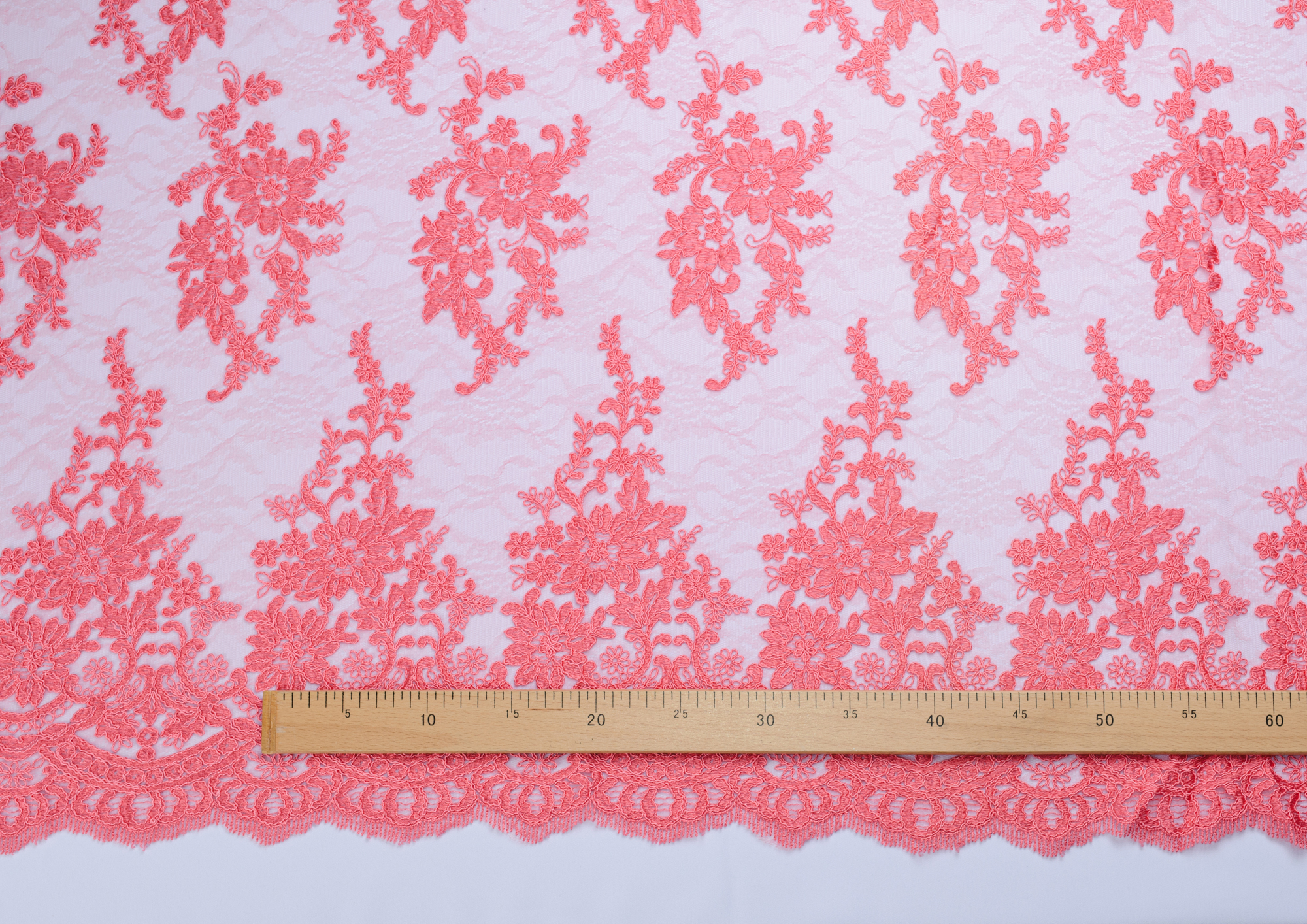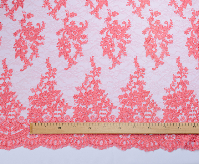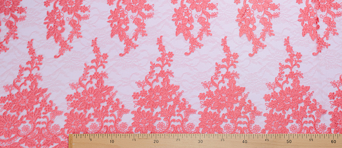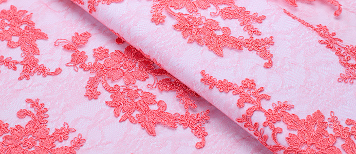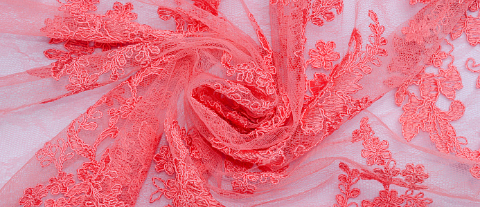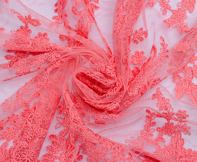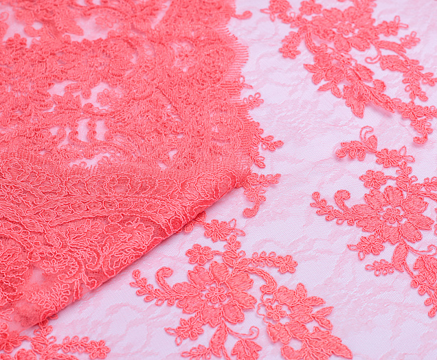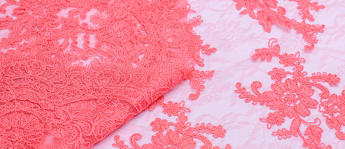 Кружево в тон полотна, фестоны с двух сторон, выполнена на тонкой сеточке. По всем полотну равномерно расположен цветочный орнамент 3d. При пошиве требует подклада. Из кружево шьют нарядные, вечерние, торжественные платья, костюмы.