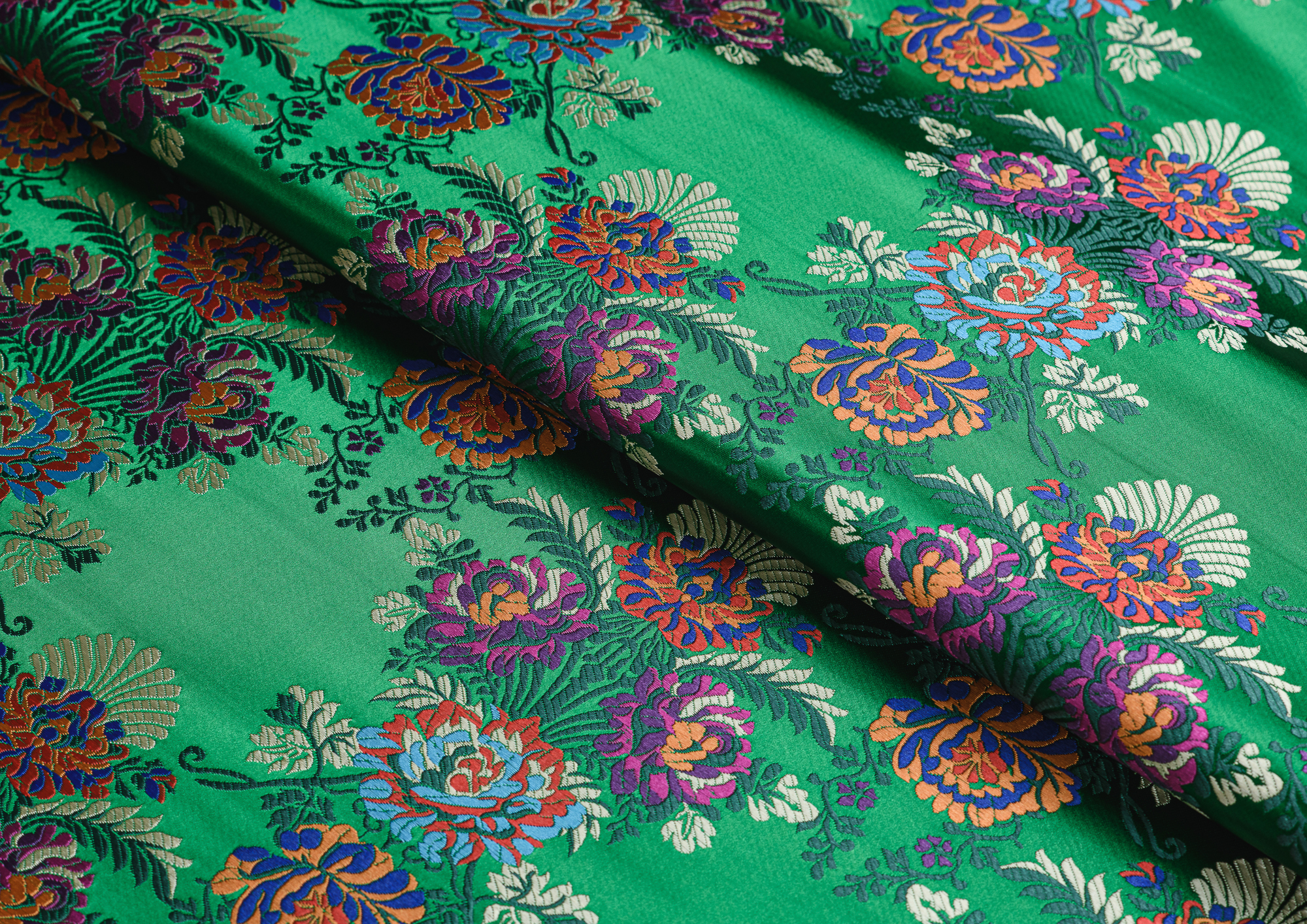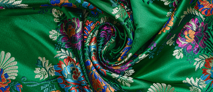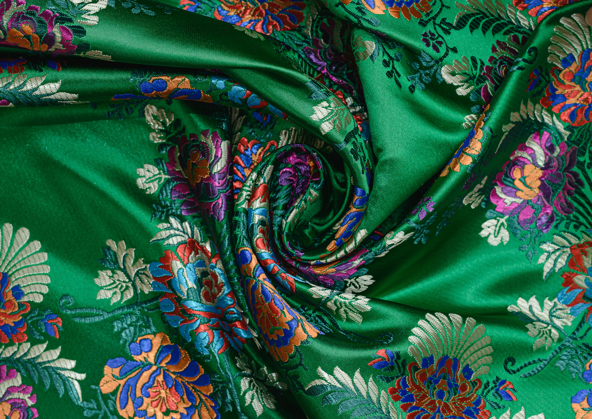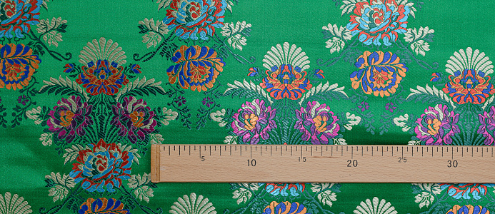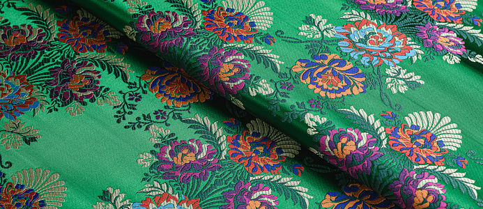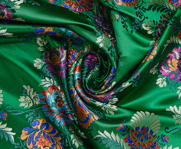 Атласная жаккардовая ткань, по всей поверхности нанесен цветочный орнамент. Ткань плотная, хорошо держит форму, подходит для пошива костюмов в Азиатском стиле: халаиы, кимоно, а также для изготовления покрывал, наволочек и других элементов декора интерьера.