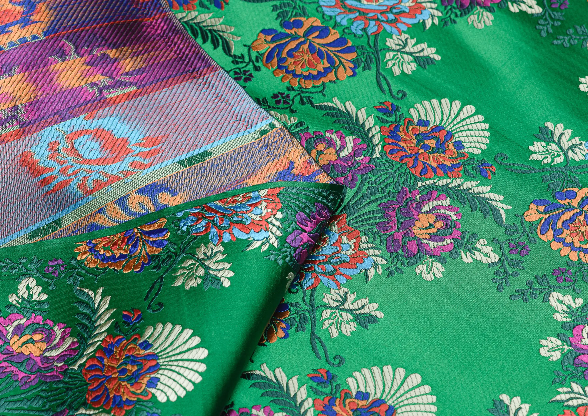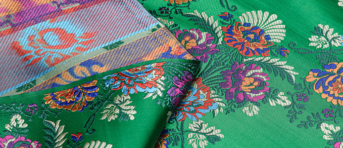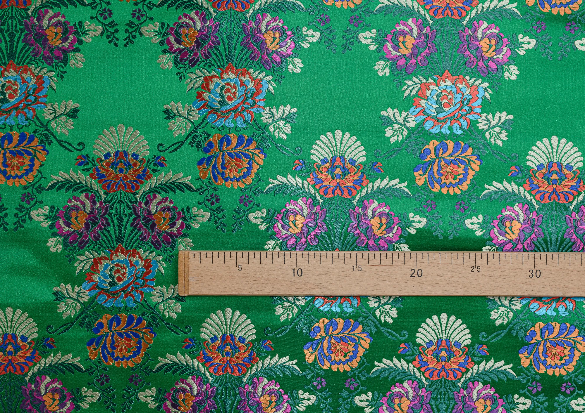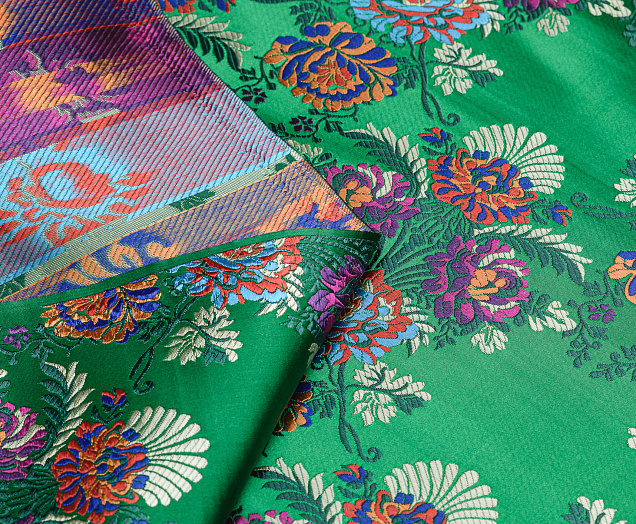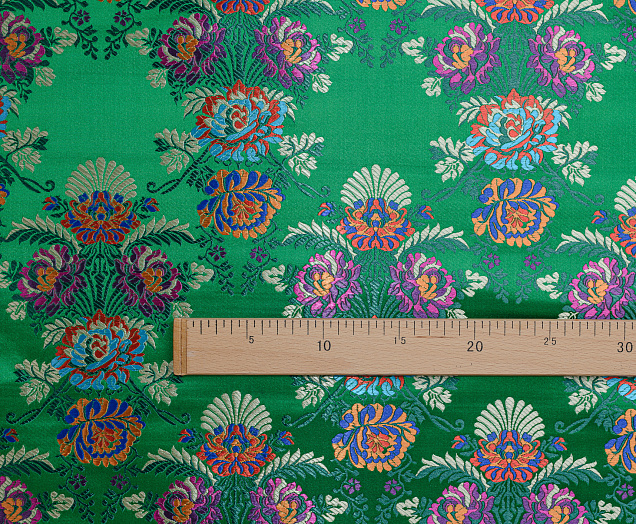 Атласная жаккардовая ткань, по всей поверхности нанесен цветочный орнамент. Ткань плотная, хорошо держит форму, подходит для пошива костюмов в Азиатском стиле: халаиы, кимоно, а также для изготовления покрывал, наволочек и других элементов декора интерьера.