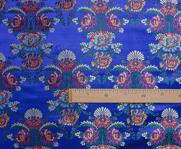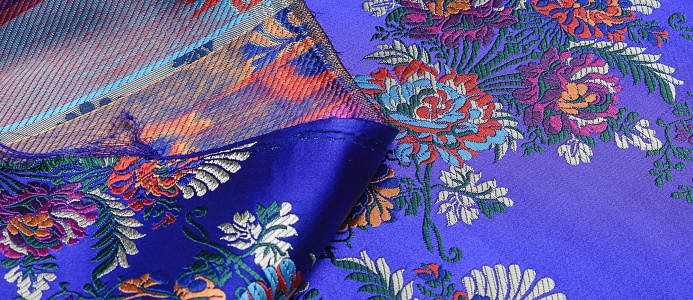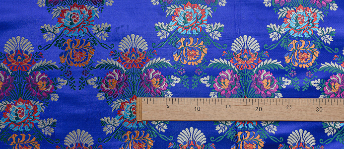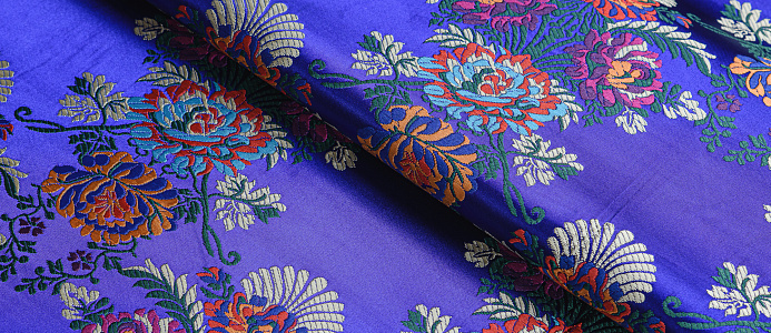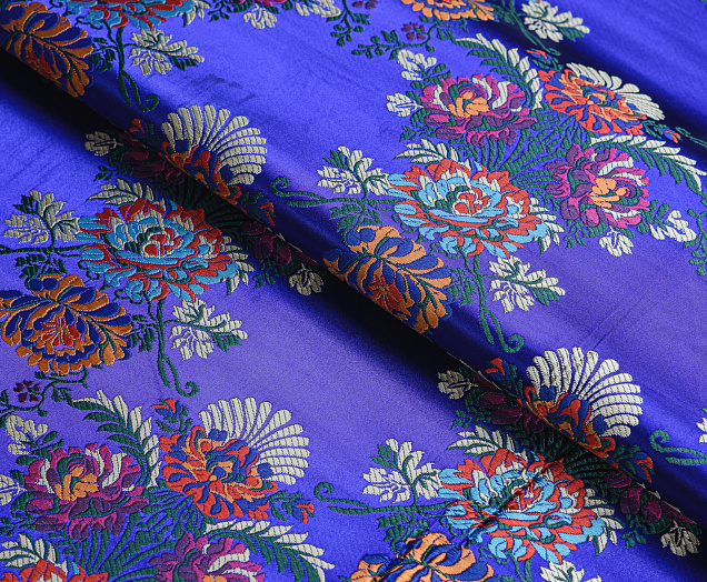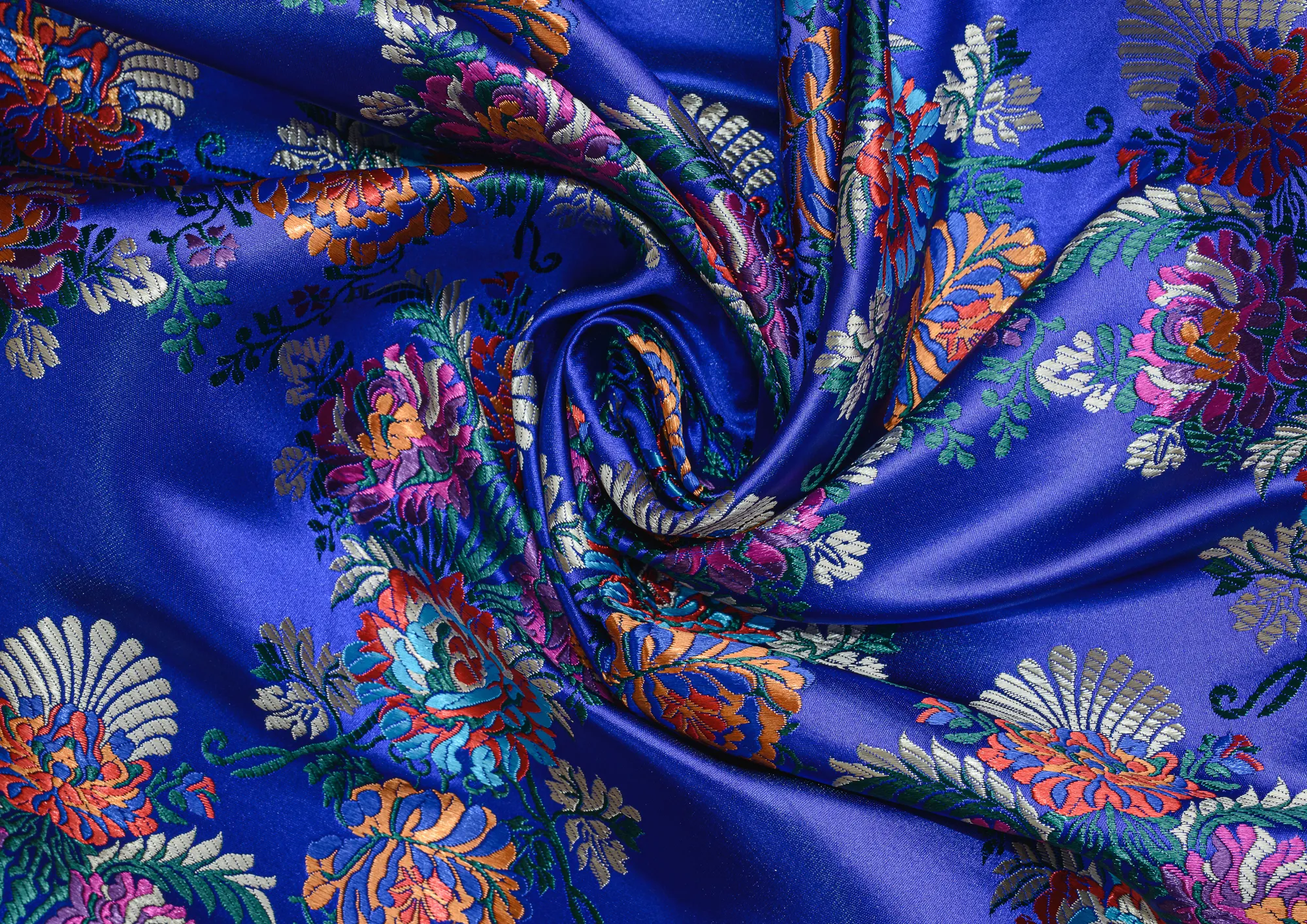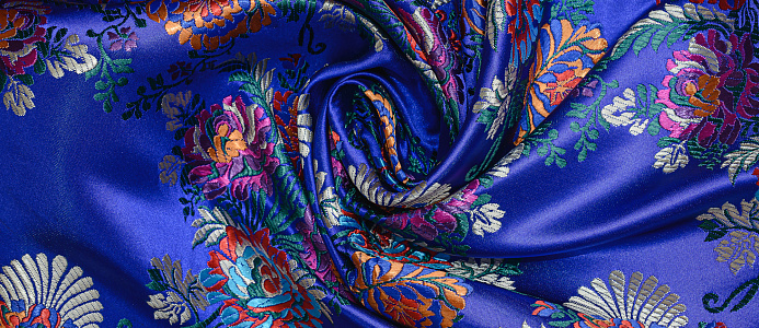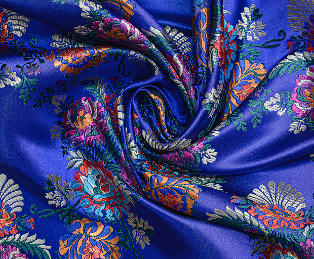 Атласная жаккардовая ткань, по всей поверхности нанесен цветочный орнамент. Ткань плотная, хорошо держит форму, подходит для пошива костюмов в Азиатском стиле: халаиы, кимоно, а также для изготовления покрывал, наволочек и других элементов декора интерьера.
