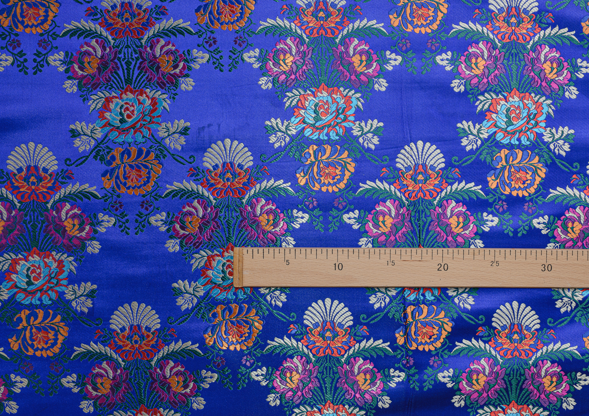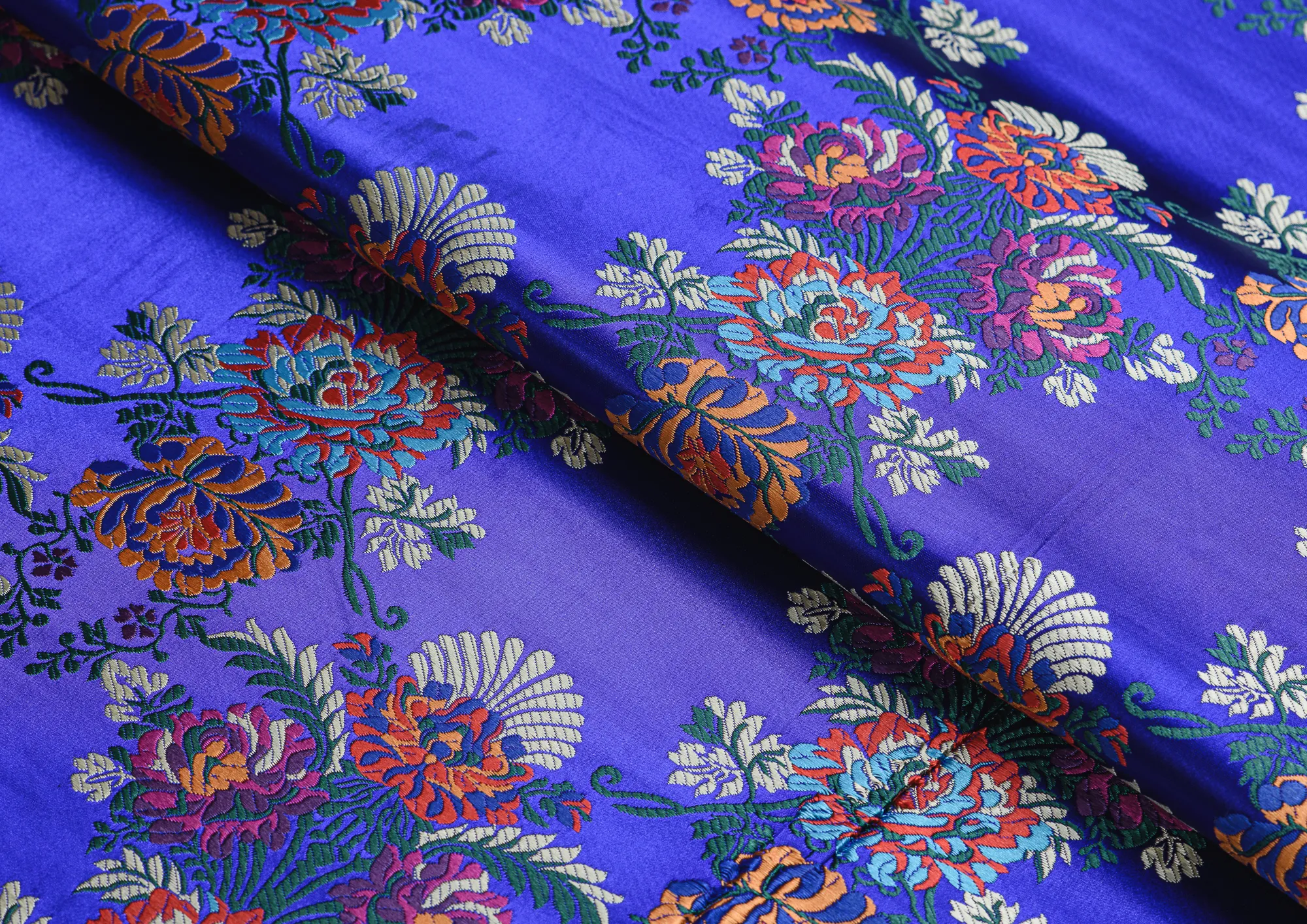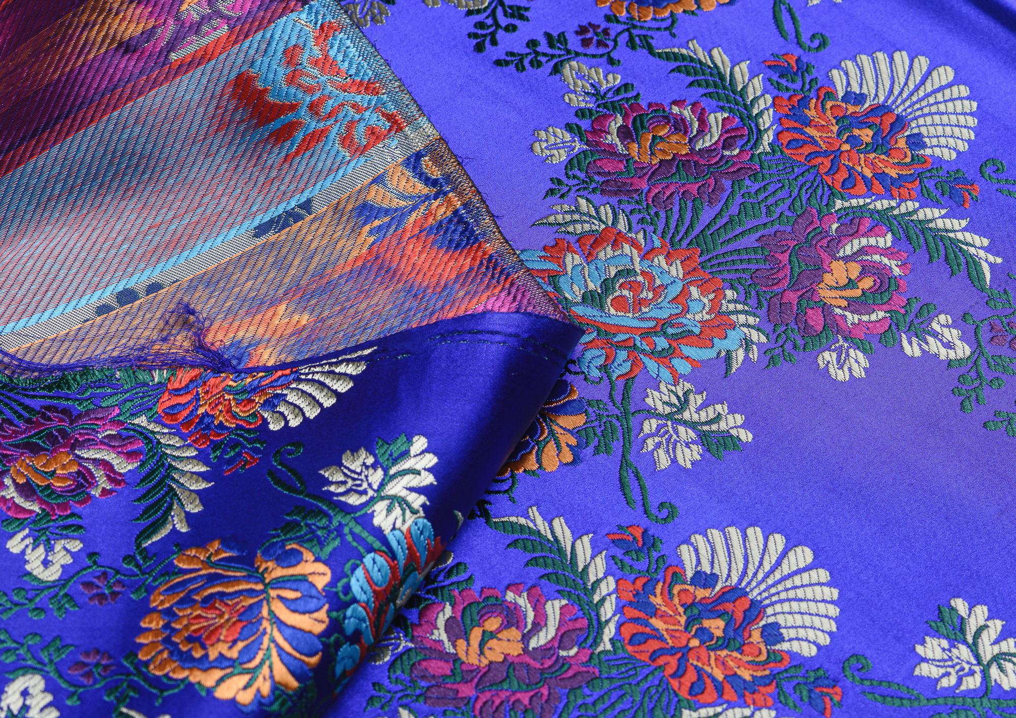 Атласная жаккардовая ткань, по всей поверхности нанесен цветочный орнамент. Ткань плотная, хорошо держит форму, подходит для пошива костюмов в Азиатском стиле: халаиы, кимоно, а также для изготовления покрывал, наволочек и других элементов декора интерьера.
