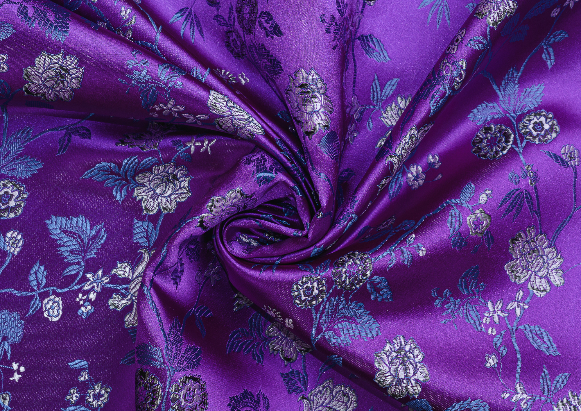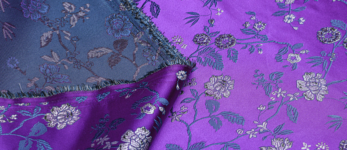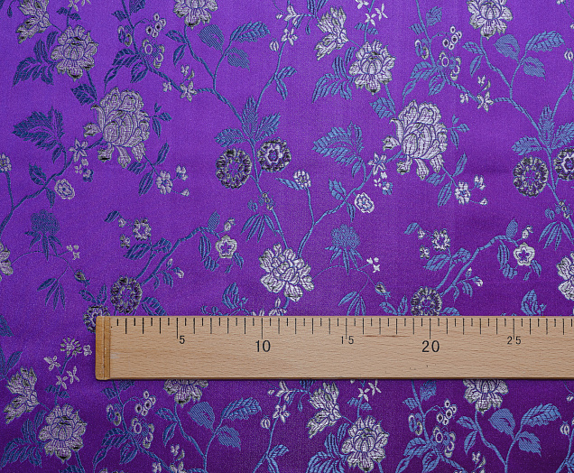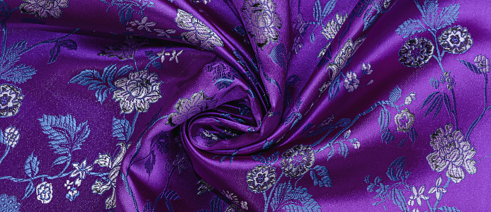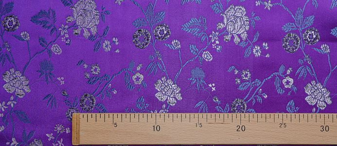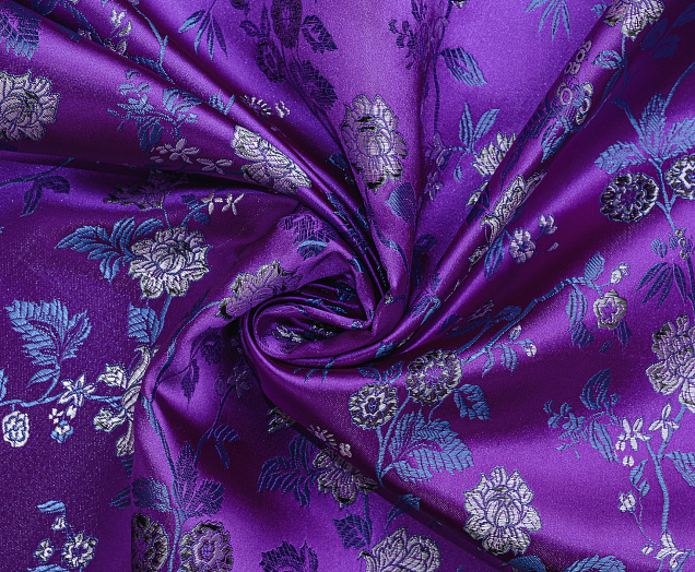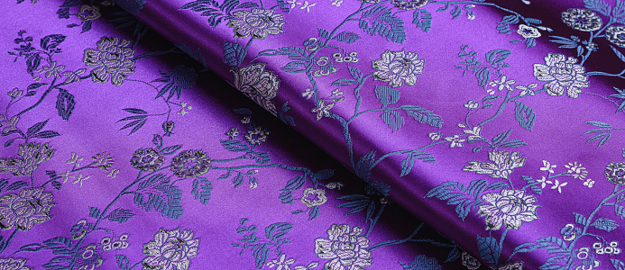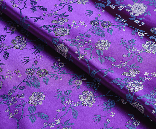 Атласная жаккардовая ткань, по всей поверхности нанесен цветочный орнамент. Ткань плотная, хорошо держит форму, подходит для пошива костюмов в Азиатском стиле: халаиы, кимоно, а также для изготовления покрывал, наволочек и других элементов декора интерьера.