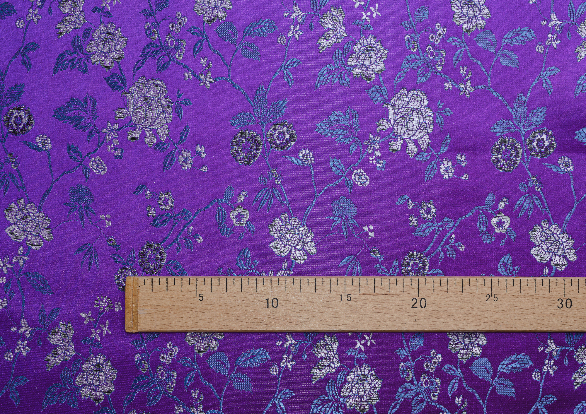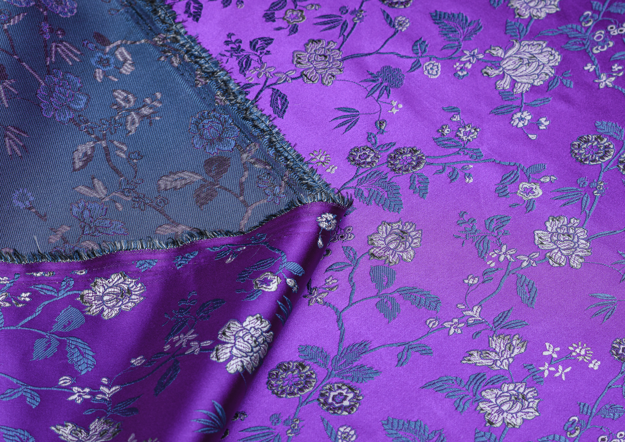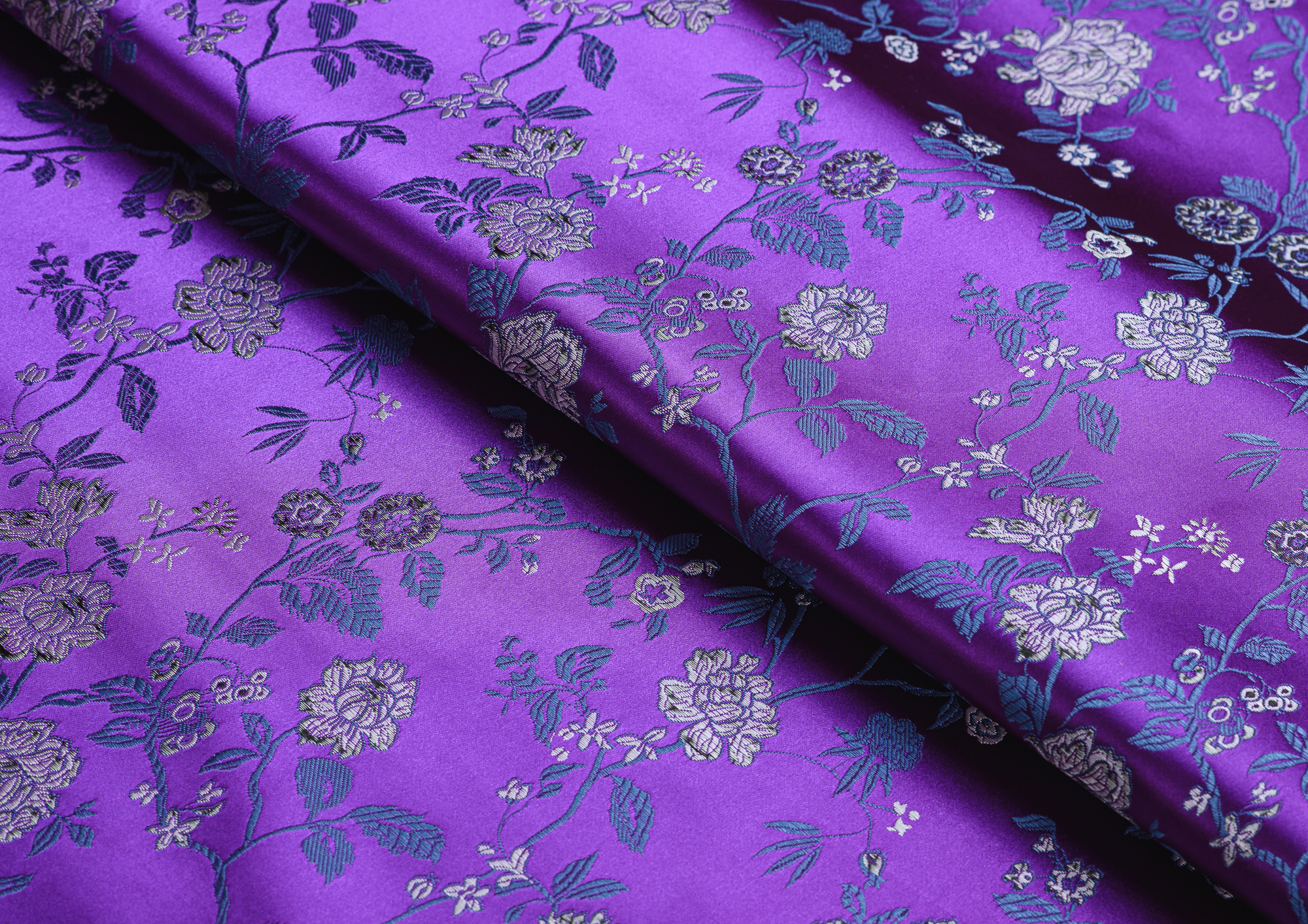 Атласная жаккардовая ткань, по всей поверхности нанесен цветочный орнамент. Ткань плотная, хорошо держит форму, подходит для пошива костюмов в Азиатском стиле: халаиы, кимоно, а также для изготовления покрывал, наволочек и других элементов декора интерьера.