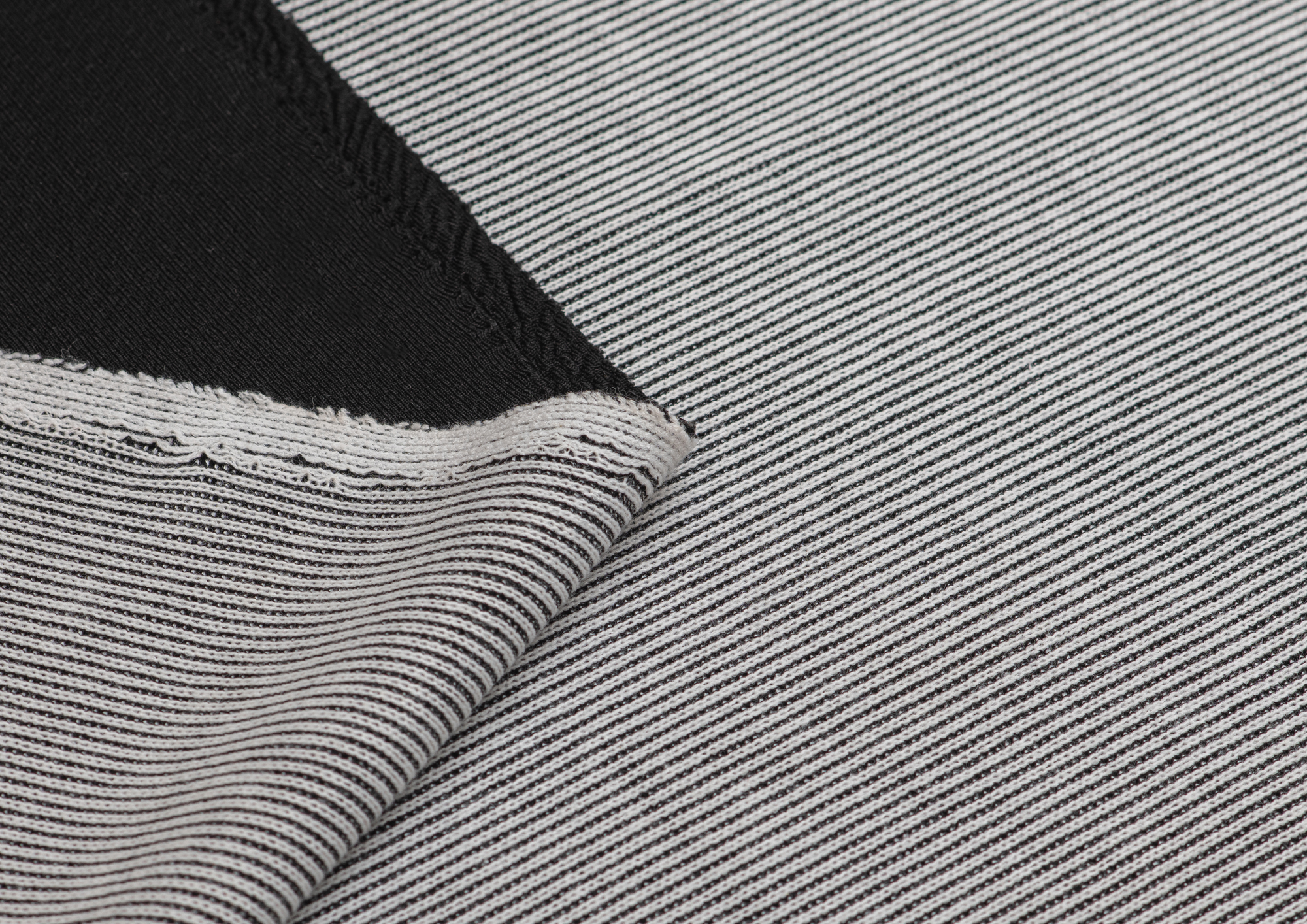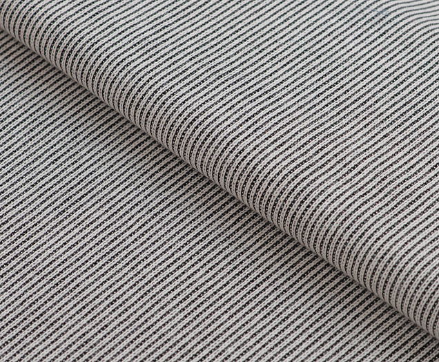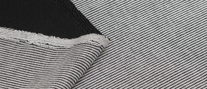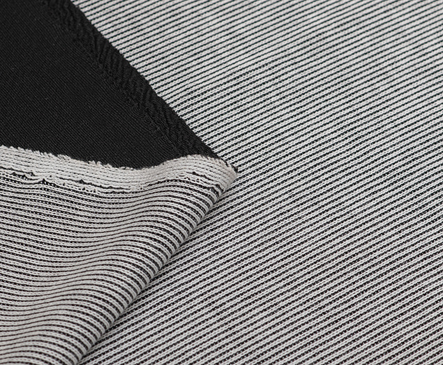 Двухслойное трикотажное полотно средней плотности. Лицевая сторона связана резинкой.  Изнаночная - мягкая, матовая,трикотажная черного цвета . Материал эластичен, мягкий, приятный на ощупь. Трикотаж уютный, приятный к телу и удобный в носке. Платья, юбки, жакеты из джерси прекрасно смотрятся на фигуре.